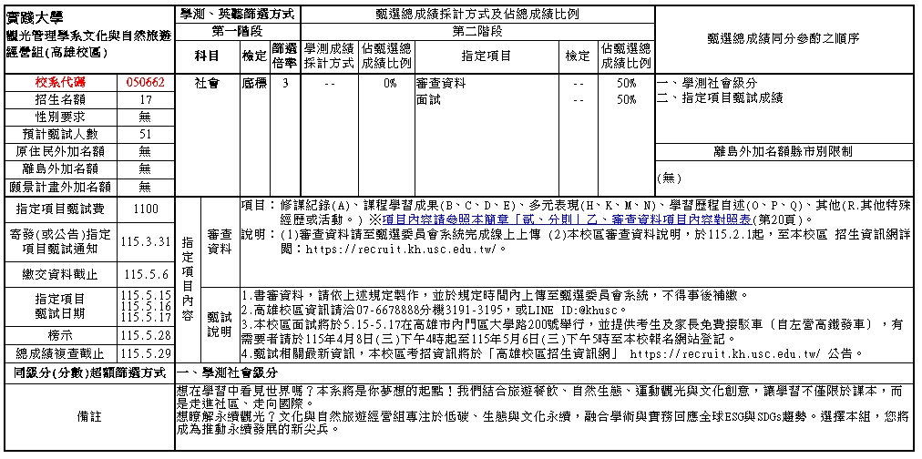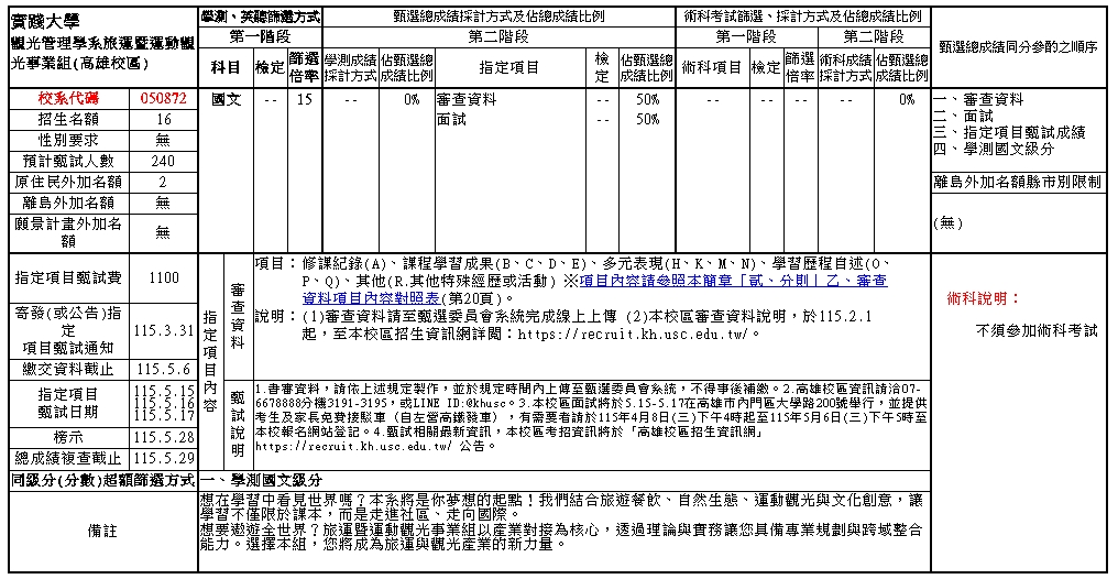 本校招生網:https://recruit.kh.usc.edu.tw/p/412-1012-1085.php?Lang=zh-tw